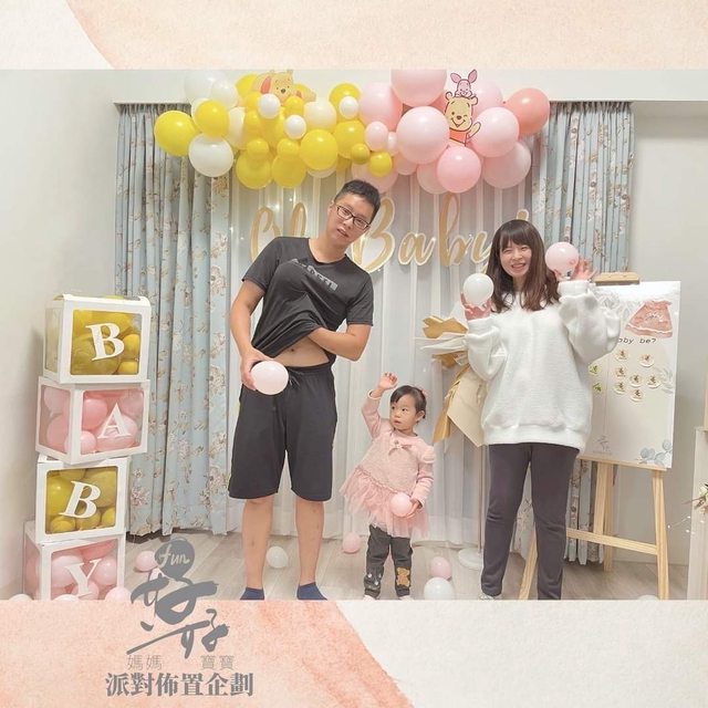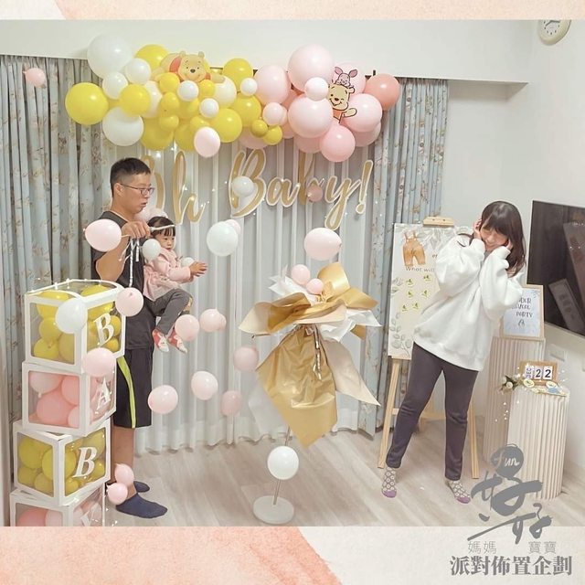 這次很喜歡好好FUN派對幫忙布置的黃色與粉色氣球,參雜小熊維尼增添溫馨感,而周邊
