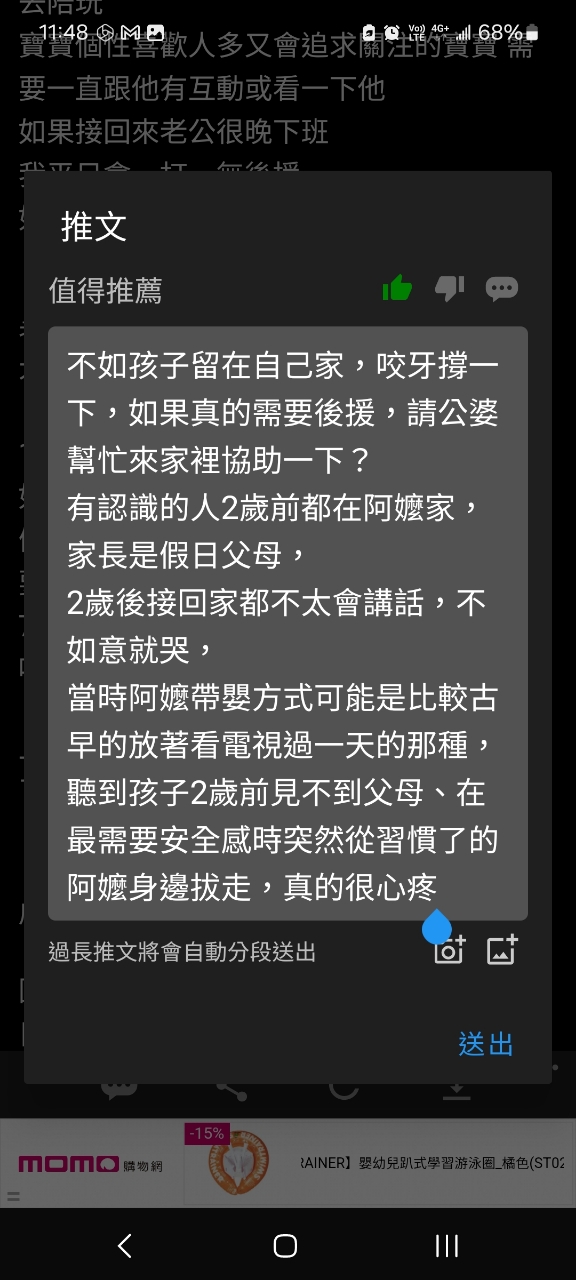 → betty0824 : 前陣子在小一聯盟看到有媽媽po文因為長輩的寵溺 04/09 09:53