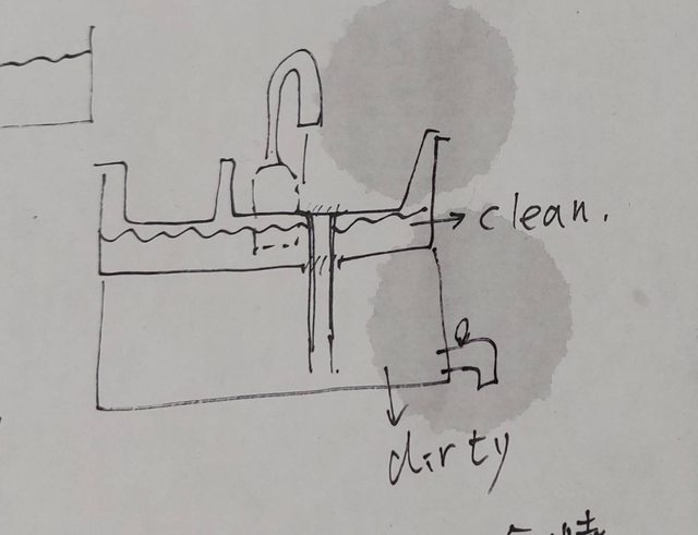 淨水在左側洗手槽直接加入,污水會通過吸管排至污水盒