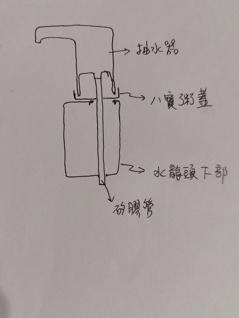 因此把水龍頭拔掉,留下下半部當底座,想辦法把抽水器黏上去就是了。