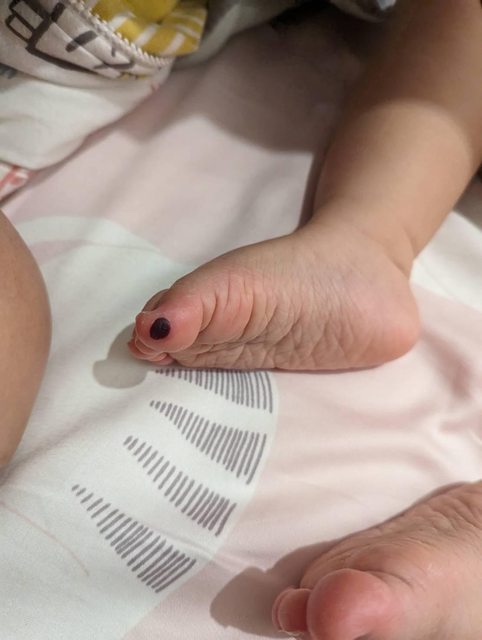 結果上週末女兒去外婆家玩,娘家媽媽打來說女兒趁大人沒注意時拿罐裝飲料玩,沒拿好砸到腳趾,隔天變黑一塊在腳底…(附圖防雷)