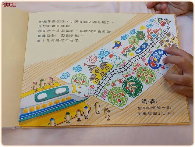 彩色蠟筆拜託小黑畫軌道,小黑本來很不願意,但禁不起大家的遊說,終於還是在留白的