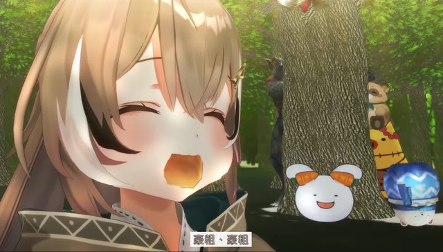 Mumei在一群吉祥物旁邊吃麵包