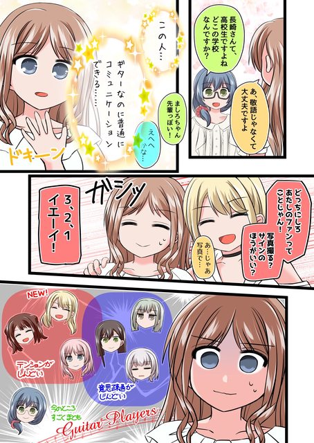 六花:長崎同學,妳是高中生對嗎?請問是哪所學校的呢 爽:不用敬語也可以喔 六花:小白好像前輩呢! 真白:嘿嘿…… 爽:這個人……原來吉他手也是可以正常交流的 透子:妳是我們的粉絲嗎?要一起拍照還是要簽名? 爽:那、那個拍照好了 透子:3、2、1耶~~~ 右邊 難以溝通 左邊 毫無緊張感 六花目前為止還不錯 想想爽世真是被吉他手迫害不少次