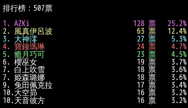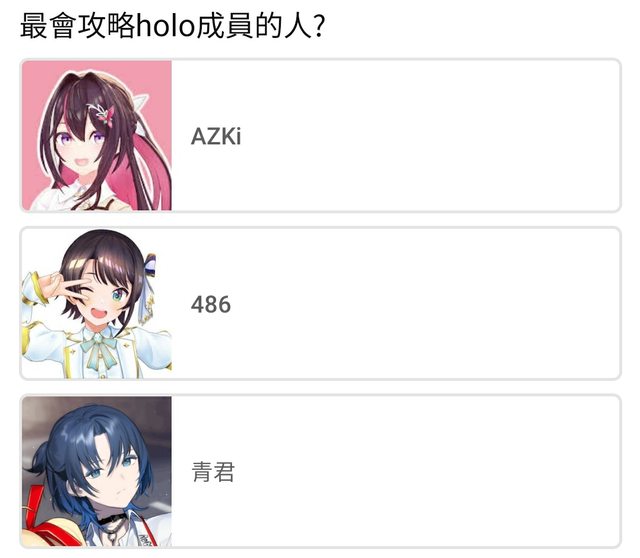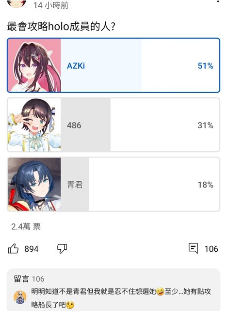可能是因為昨天青君跟船長的互動所以開的投票 結果目前快3萬票 AZKi她占超過半數XD https://i.imgur.com/D8eDyO1.jpg
