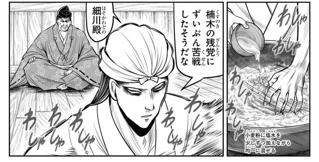 一邊揉麵團一邊教訓跟楠木殘黨苦戰的細川,要細川從此服從他命令就好