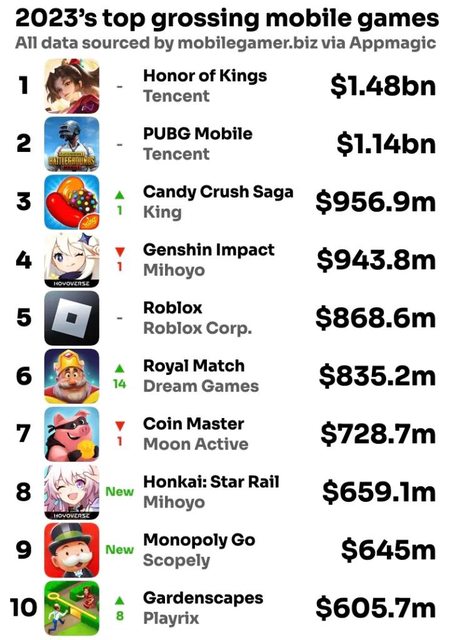 其實也不用看日本營收,你看2023全球的手遊營收前十名