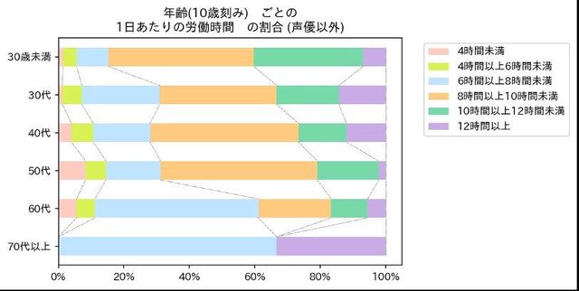 但這種工時並不會因為年齡增長而有所改善,調查中顯示50歲的人當中有69%以上一天仍