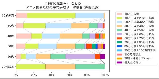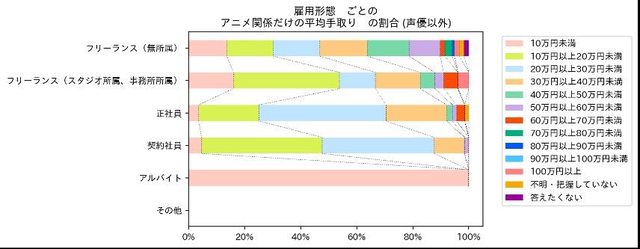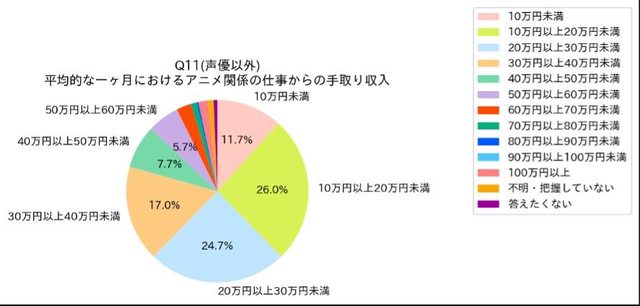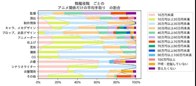 結果顯示上色以及劇本從業人員的薪水明顯偏低,超過60%以上的月收入不到20萬日幣,
