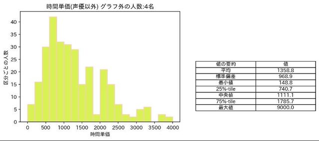 2.每小時的報酬落在600-800日幣的人占據了14%,全體的中位數則是1111