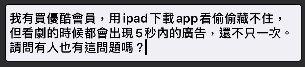 推 d61131: 我以為優酷只有開頭那種廣告,原來會員還是會有。謝謝y大~ 06/22 00:37