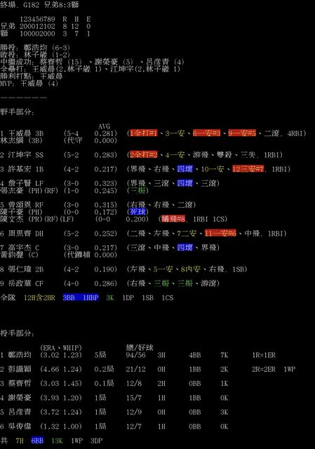標題[情報] G182 兄弟8:3獅 全場數據box