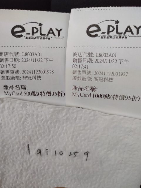 ★【物品名稱】:MyCard點數 1000點+500點