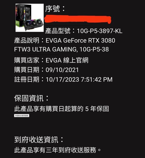 ◎硬體型號: EVGA GeForce RTX 3080 FTW3 ULTRA GAMING, 10G-P5-3897-KL