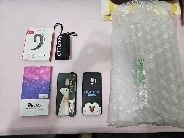 物品名稱:三星S9手機殼 螢幕保護貼 藍芽耳機 手搖杯提袋 網購包材