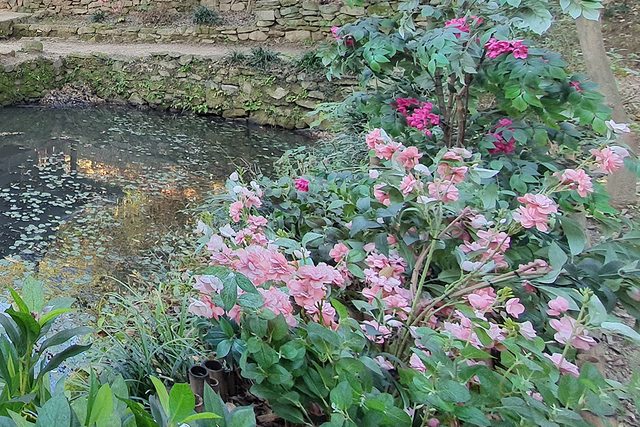 有池塘,周圍排列怪石,春天時櫻花、玉蘭和杜鵑齊放,夏天時蓮花和紫薇花盛開、景色