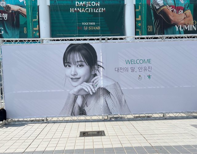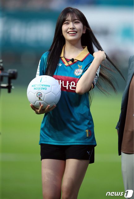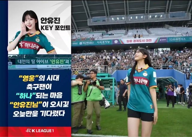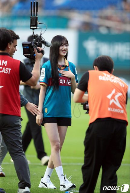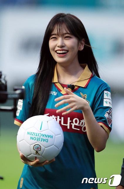 7月12日下午,在大田儒城區老隱洞大田世界盃體育場舉行的2023 Hana One Q K聯賽第12 2輪大田Hana Citizen和全北現代汽車隊的比賽中,韓亞金融集團代言人兼女團IVE成員安 俞真在開球後露出了燦爛的笑容。 https://i.imgur.com/fH1hofN.jpg