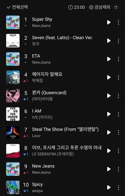 來源: theqoo https://theqoo.net/hot/2868847191 1. Cool with you去哪了 2. 雖然Super Shy本身不是我喜歡的類型,但是中毒性真的很強 3. 朴宰正的歌很好聽,繼續長紅吧 4. 全部都是我常聽的歌曲 5. 我喜歡SEVEN和ETA.. 但是怎麼沒有Cool with you 6. 看到宰正終於紅起來了,姐姐我好幸福啊 7. 這個陣容裡面竟然有朴宰正,真的好厲害 8. NewJeans的歌曲都是我喜歡的類型,整張專輯的歌都很好聽.. 如果Get Up能再長一點就 好了,我真的超愛這首 9. HYBE真厲害 10. I'm a Queencard 11. 而且柾國的還是英文歌耶,真了不起 12. Lauv和Charlie Puth幾乎就像韓國歌手了......... 13. 希望Get Up的名次能上升,然後下次一定要出完整版的歌曲... 14. SEVEN啊,你要好好撐住!!!! 15. 柾國的歌曲我怎麼聽都聽不膩 翻譯來源:FB@韓網評論翻譯站 目前 7/25 16:00 KST https://i.imgur.com/Nhln4qM.jpg