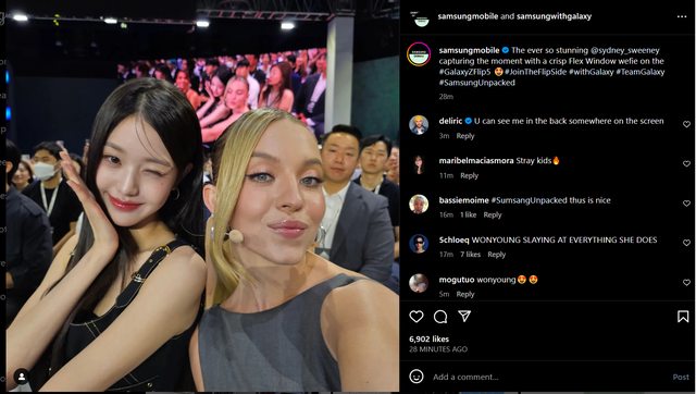 三星電子剛剛發表了最新系列的摺疊手機 過程中也安排有明星現場展演,在Flip 5登場時Sydney Sweeney現場就拿出 實機與身旁的員瑛自拍,照片也立刻上傳到官方IG。 https://i.imgur.com/6ET1Dxy.png