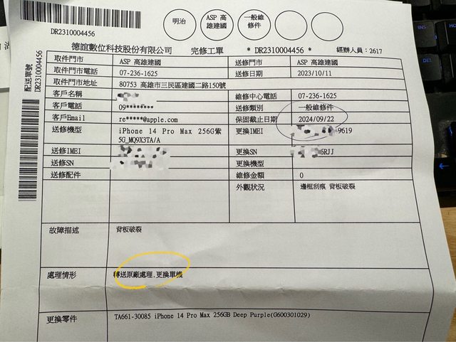 原機就有加買AC+,之後背板破裂送修,原廠免費更換全機。