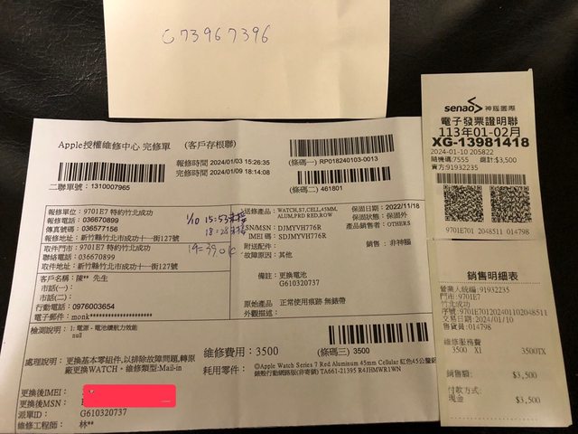 1.2024/01/10電池因素維修後取回,直接更換全新整新機(電池量100%)。