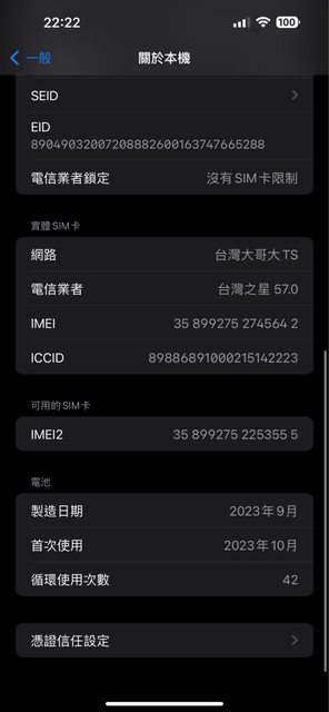 物品狀況:電池健康度100%,無傷,循環次數42次