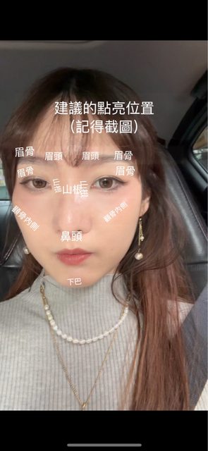 我習慣打在以下位置,但會碰到瀏海的地方就不用了,底妝會毀掉
