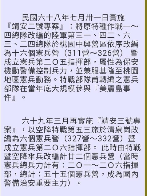 憲兵遷台後組織員額高峰是靖安專案時期近3萬人,當年有6個指揮部,55個營,年代基本