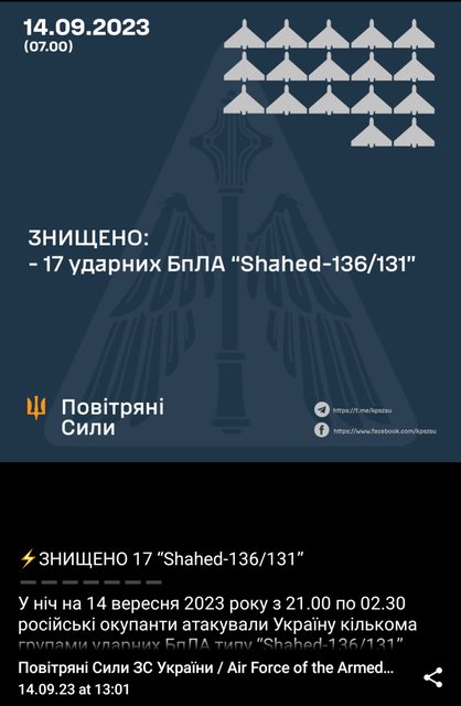 2023年9月14日晚9點至凌晨2點30分,俄羅斯入侵者出動多組“Shahed-136/131”型無人機從喬達角-克里米亞、喬達角-克里米亞三個方向襲擊烏克蘭。耶伊斯克,庫爾斯克 - 俄羅斯聯邦。
