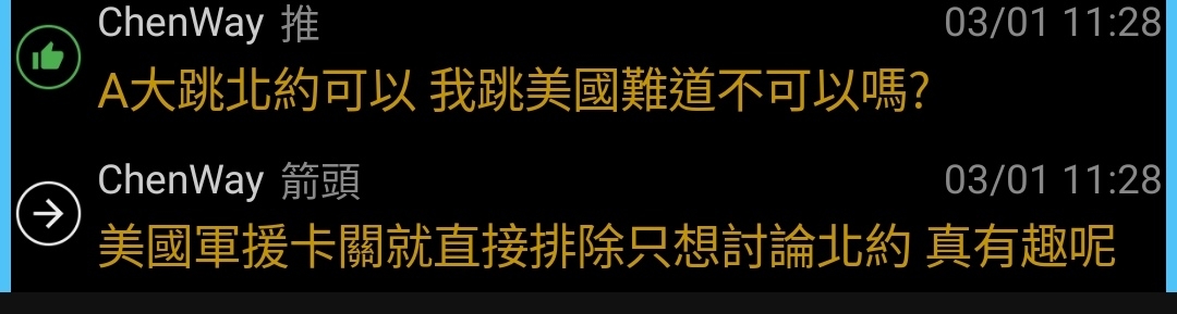 → LI40 : 更好笑的是其他人都覺得是在框架內討論北約軍援 有 03/02 02:41