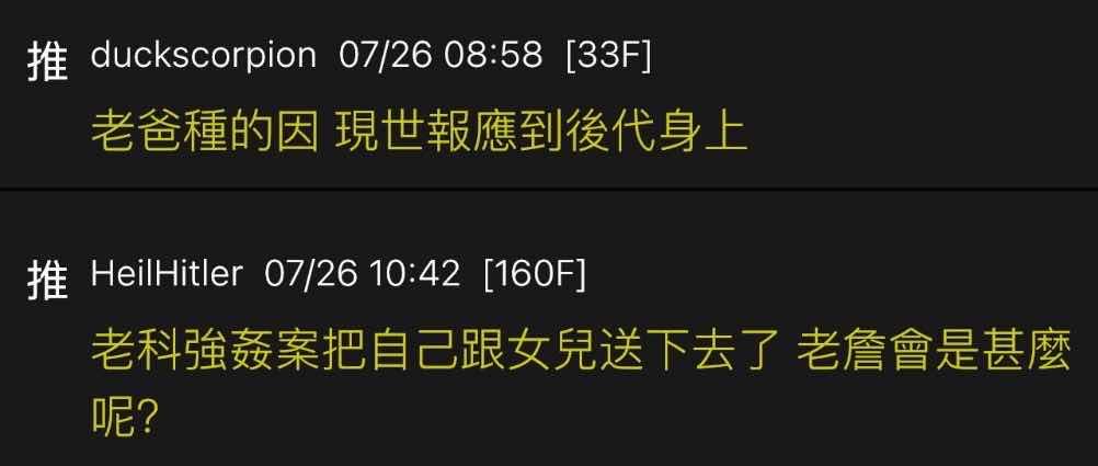 噓 kira123 : 酸過頭了好嗎 還是酸民上代都當奸犯科才讓你們變成 07/26 09:06