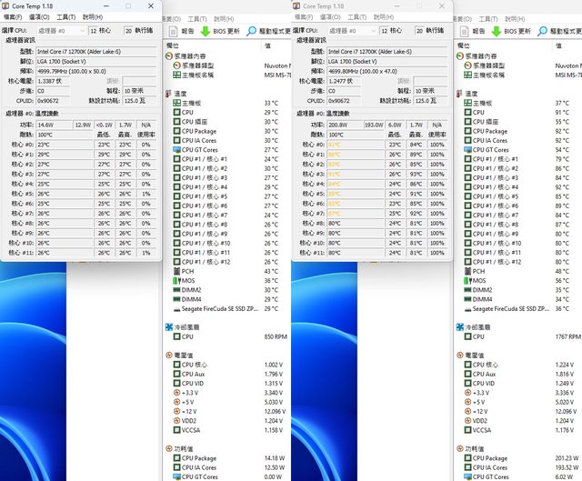 ▼前面12公分風扇搭中間14公分風扇時待機(左)及高負載(右)的CORE TEMP及AIDA64感測
