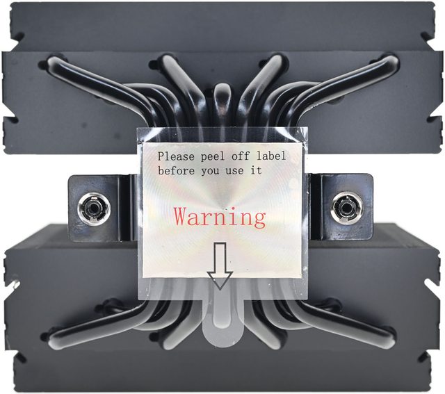 ▼散熱器底座的處理器接觸面有一張保護貼,上面用英文標示”警告,使用前請撕除保護
