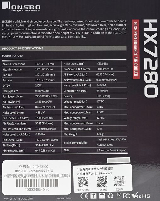 JONSBO喬思伯HX7280散熱器規格: