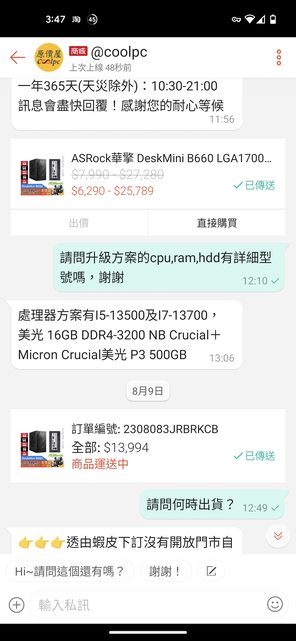 推 hugh509: 有訂單資訊和聊聊,可以了 114.41.97.90 08/19 17:28