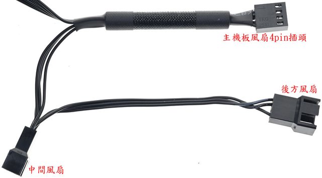 扇連接插座連接中間風扇及後方風扇。主機板風扇4pin插頭的線路有套管
