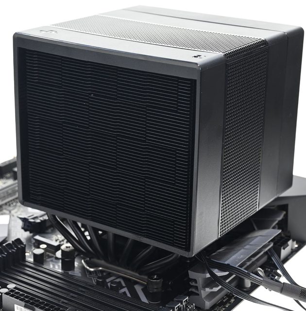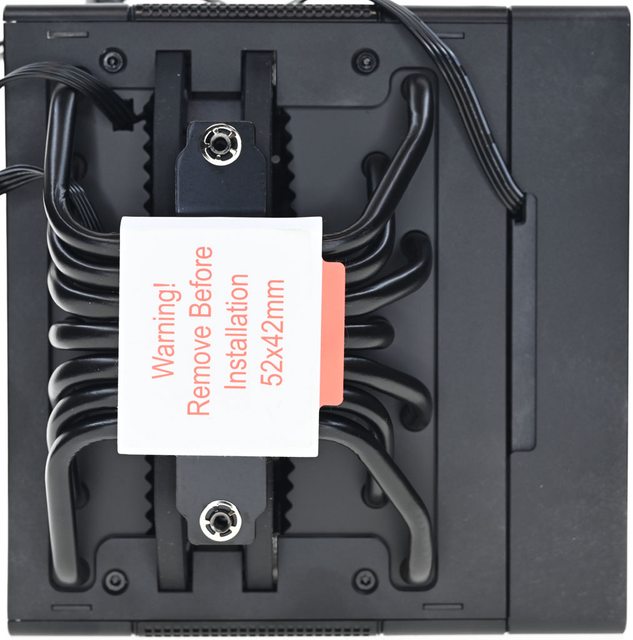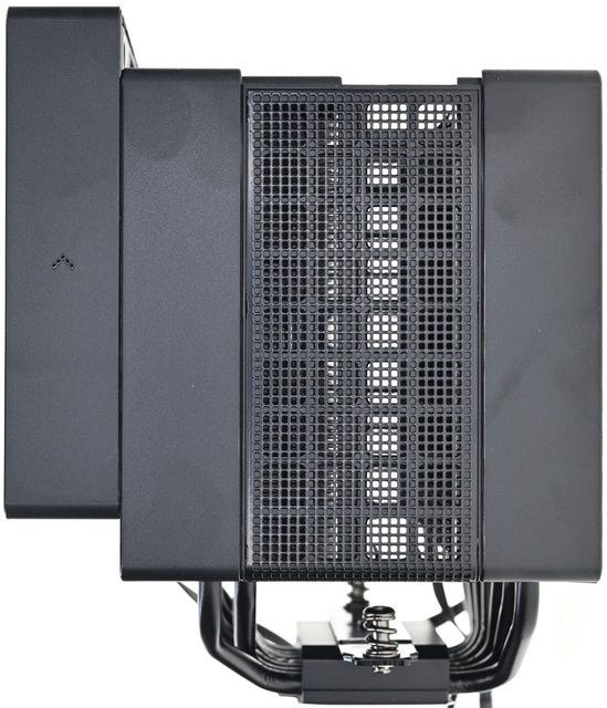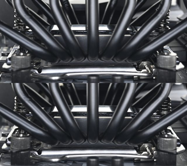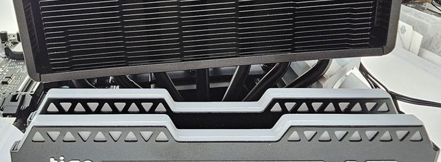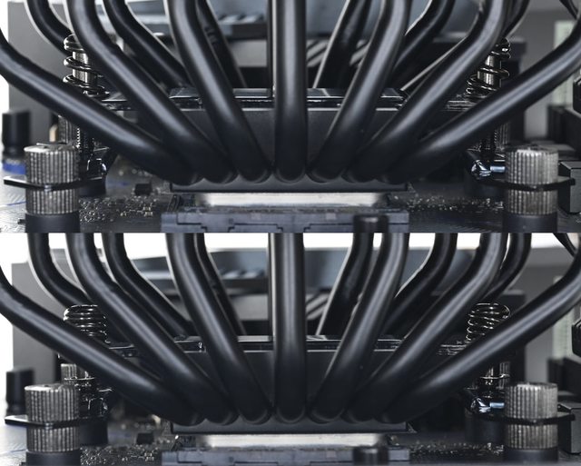 器採向後偏移設計,不阻擋前方記憶體燈光及拆裝,7支直徑6mm熱導管搭配52層雙塔黑化