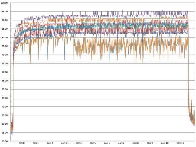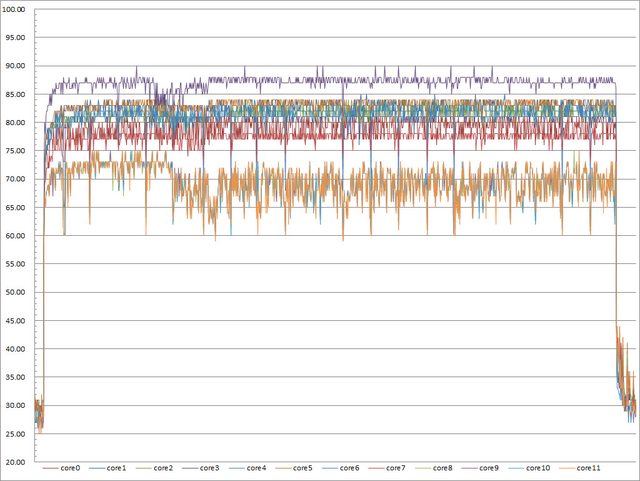▼效能模式高負載30分鐘CORE TEMP溫度記錄圖