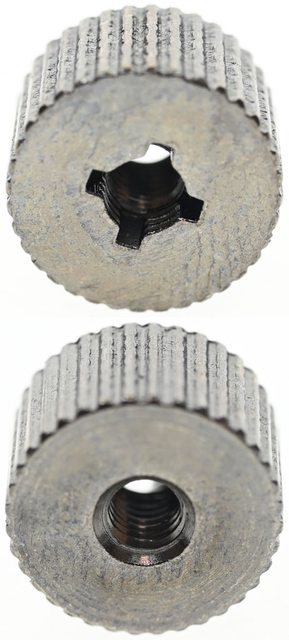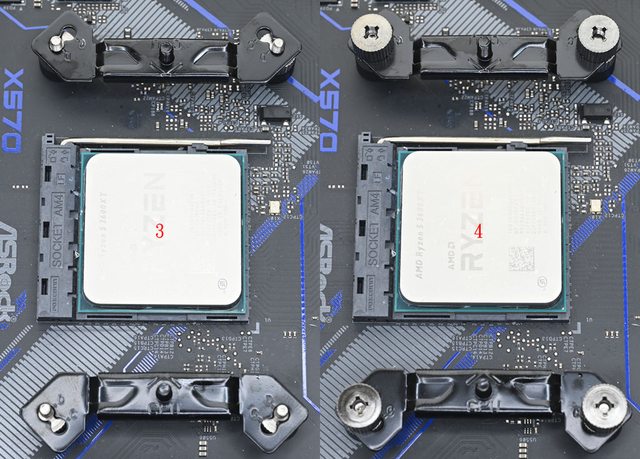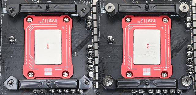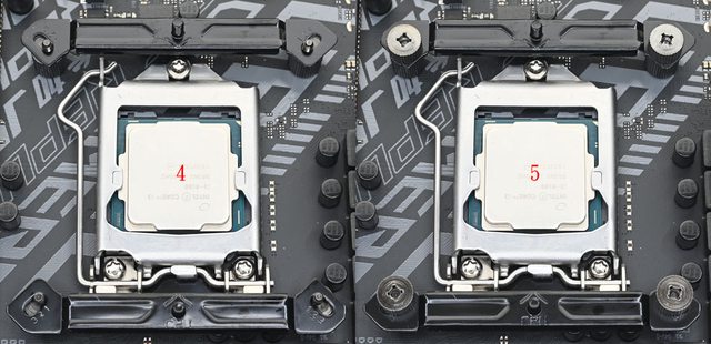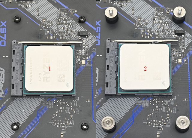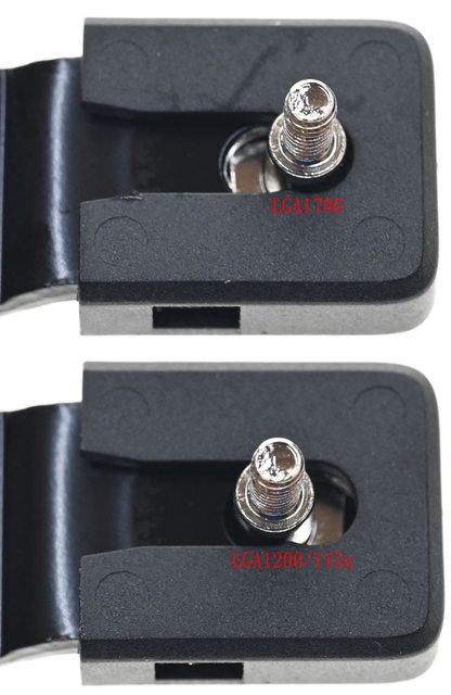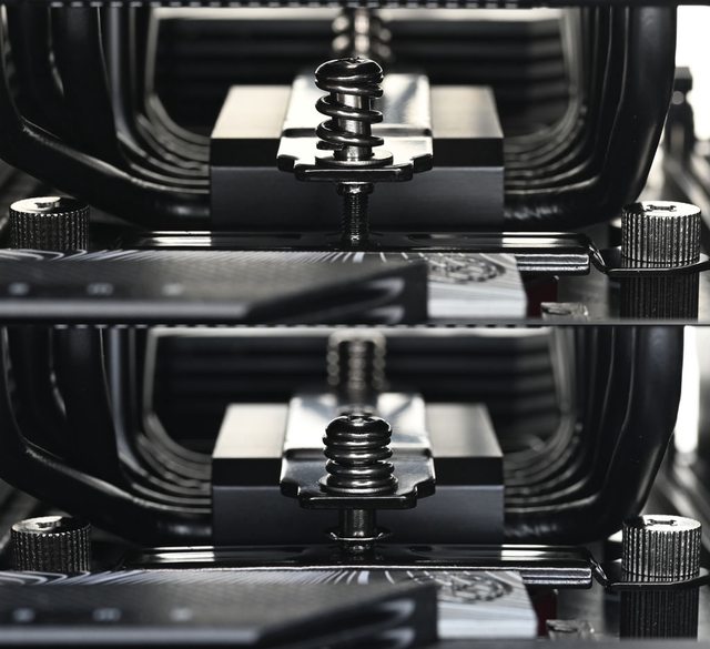 ▼散熱器底座的壓板兩邊設置鎖在托架上的彈簧螺帽,處理器接觸面有一張保護貼,上面