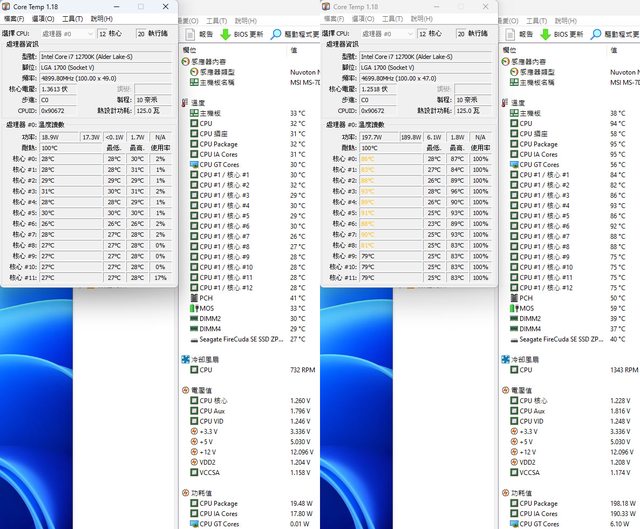▼靜音模式待機(左)及高負載(右)的CORE TEMP及AIDA64感測器畫面