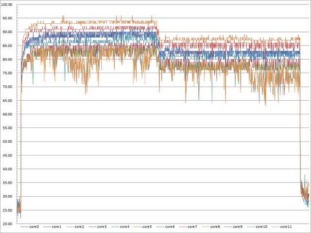 ▼高負載前半段以靜音模式運作,後半段以效能模式運作的CORE TEMP溫度記錄圖
