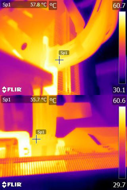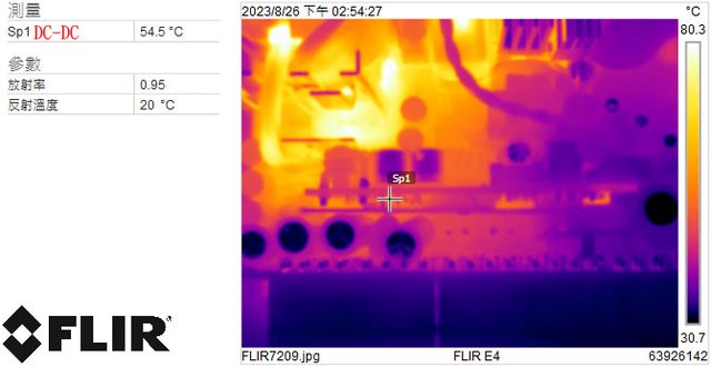 ▼執行FURMARK 30分鐘後電源端插頭的紅外線熱影像圖(附註:安裝位置環境溫度會影響
