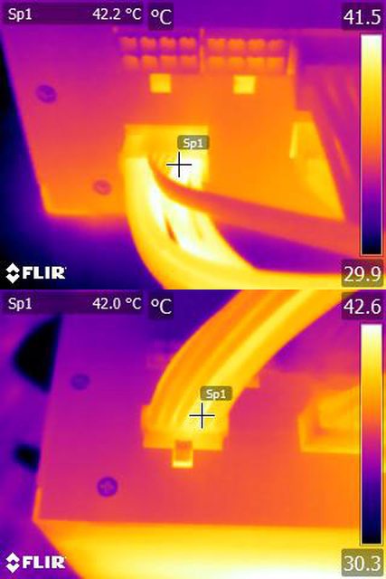 ▼單條PCIE 6+2P連續輸出21A(252W)10分鐘後的電源端模組化接頭紅外線熱影像圖(附註