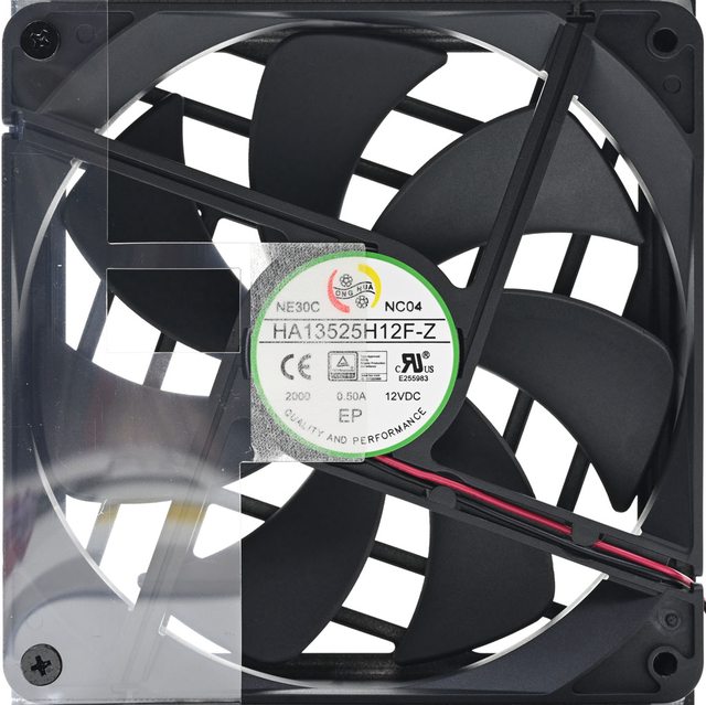 ▼採用Hong Hua HA13525H12F-Z 13.5公分12V/0.5A風扇,並設置氣流導風片