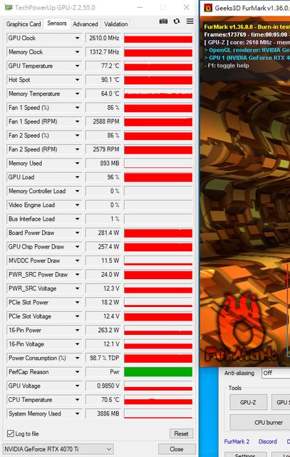 後面會買一條PCIe延長線,在裸測狀態下重新測過一遍魔龍4090及白龍4070Ti