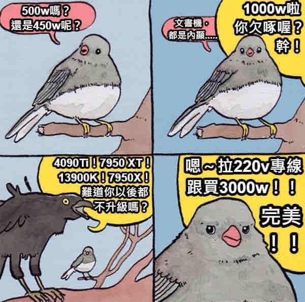 推 c752: CPU最多150w,GPU頂多300 剩下的很夠啦 123.194.118.70 09/24 23:33