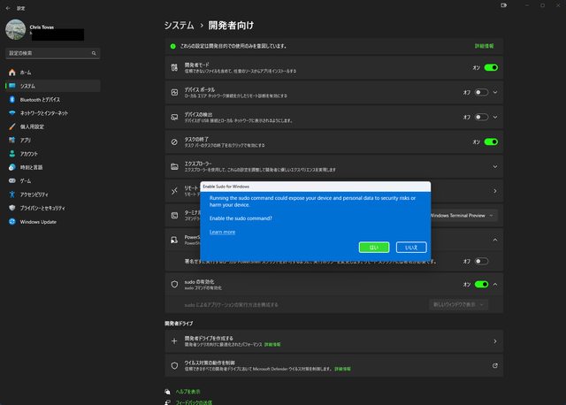 Windows可以支援Sudo指令,必須要透過設定>系統>開發人員選項 開啟Sudo有效化