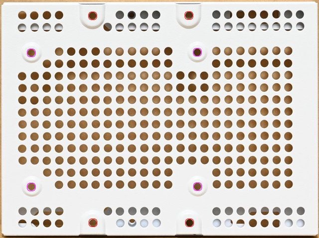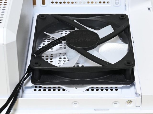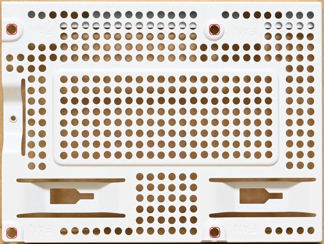 ▼底部前方風扇固定板除了網狀通風孔外,還有1個120mm風扇鎖點(紅色孔)