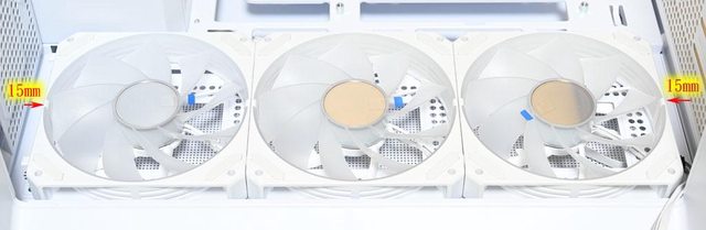 ▼右側前方風扇固定板與主機板銅柱頂端之間高度落差16mm