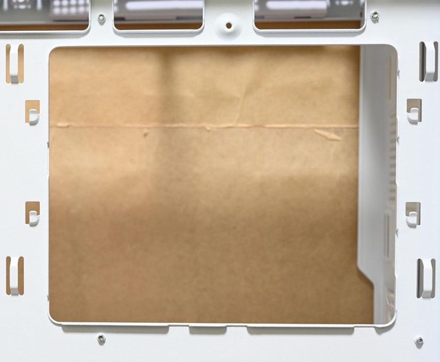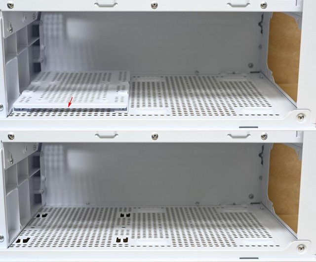 ▼取下主機板底板後方3.5吋/2.5吋固定板後,可看到底板鏤空區域